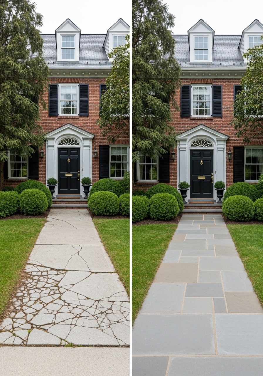 A cracked or settled walkway doesn't have to mean a full excavation and pour. Stamped concrete overlays in a flagstone pattern can resurface a structurally sound path for a fraction of full replacement cost - typically $10–16 per sq ft versus $18–30 for new pour plus disposal. The flagstone pattern works particularly well for craftsman, ranch, and cottage-style homes where the organic irregular slab shape fits the architecture naturally. The surface is sealed against water infiltration which extends the life of the path and prevents future cracking from freeze-thaw cycles. Upload a photo of your front path to see how the flagstone look could work.