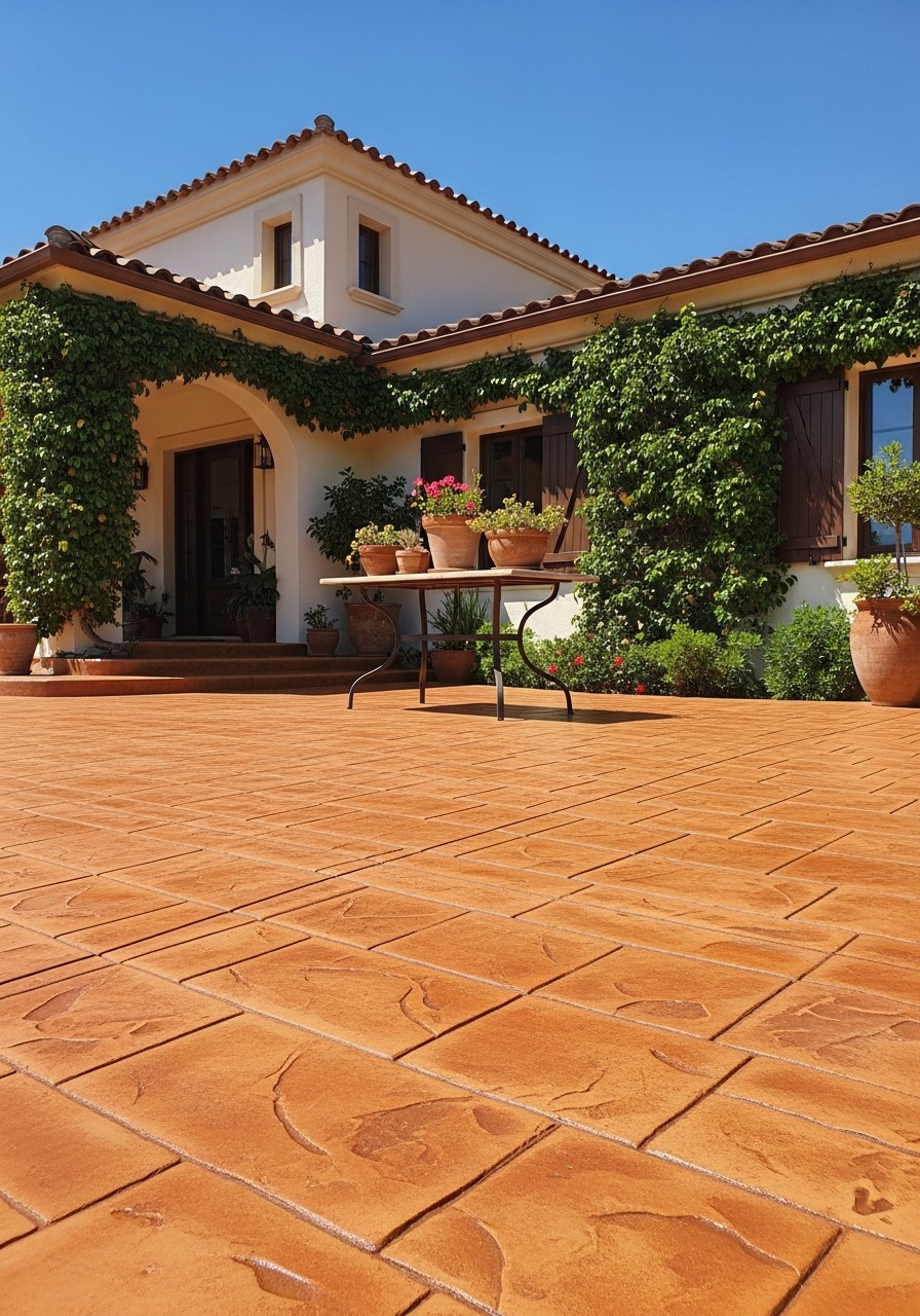 Terracotta is the strongest visual statement in the concrete colour palette - warm, earthy, and unmistakably Mediterranean. The range moves from a light clay-orange (close to natural unglazed terracotta tile) through to a deep burnt sienna that reads almost red in direct sun. Lighter terracotta suits Spanish colonial, hacienda, and stucco homes where the warm colour fits the architectural language. Deeper tones work for contemporary homes where the patio is intended as a colour-forward design element. Terracotta concrete is achieved through iron oxide pigments - the colour is UV-stable and does not fade significantly over time, unlike painted surfaces. On stamped patios, terracotta is often combined with a dark brown antiquing wash to deepen the joints and add tonal complexity. See the terracotta palette on your outdoor surface.